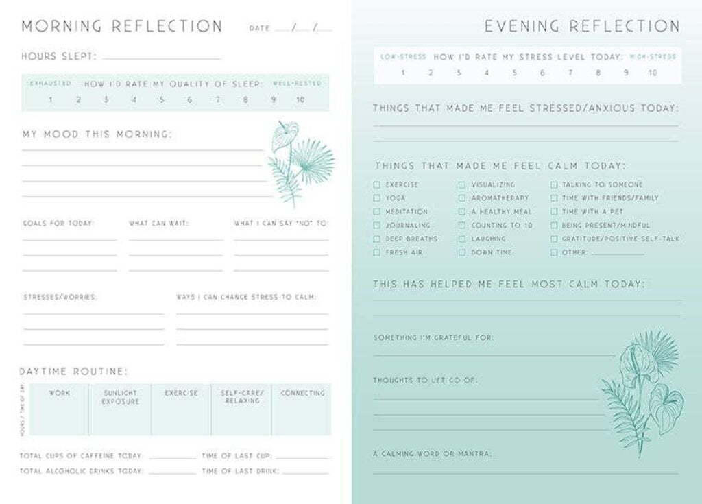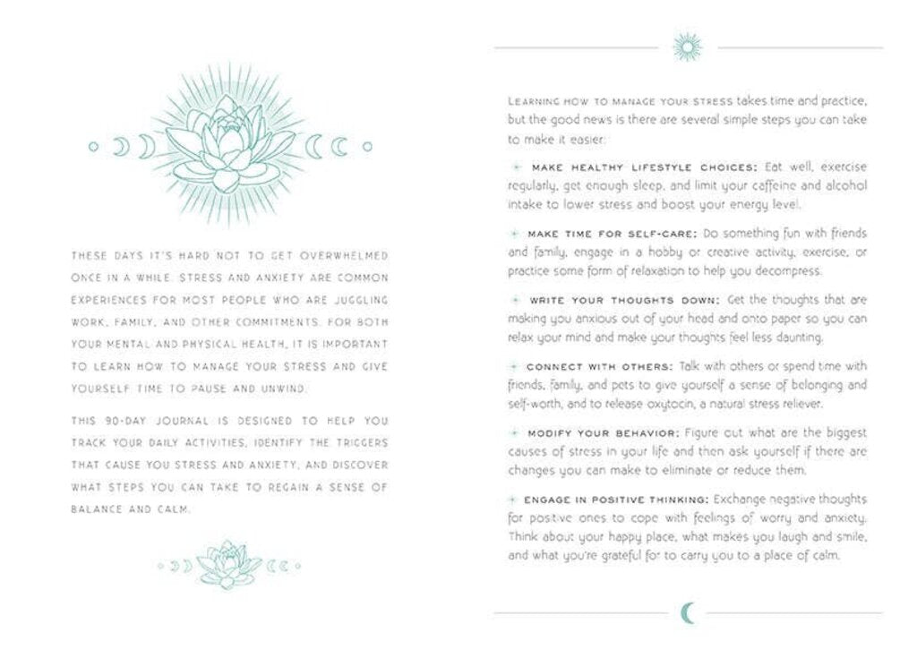 For both your mental and physical health, it is important to learn how to manage your stress. Calm: A Day and Night Reflection Journal is a conscious tool to help you track and analyze your stress and anxiety trigger points, and to reflect on what steps you can take to regain a sense of control and calm. Designed as a 90-day support system, each daily spread includes a morning practice for recording your mood, stresses, goals, and activities for the day; and an evening practice to reflect on how the day’s activities contributed to your stress level and what worked best to increase your feeling of calm.