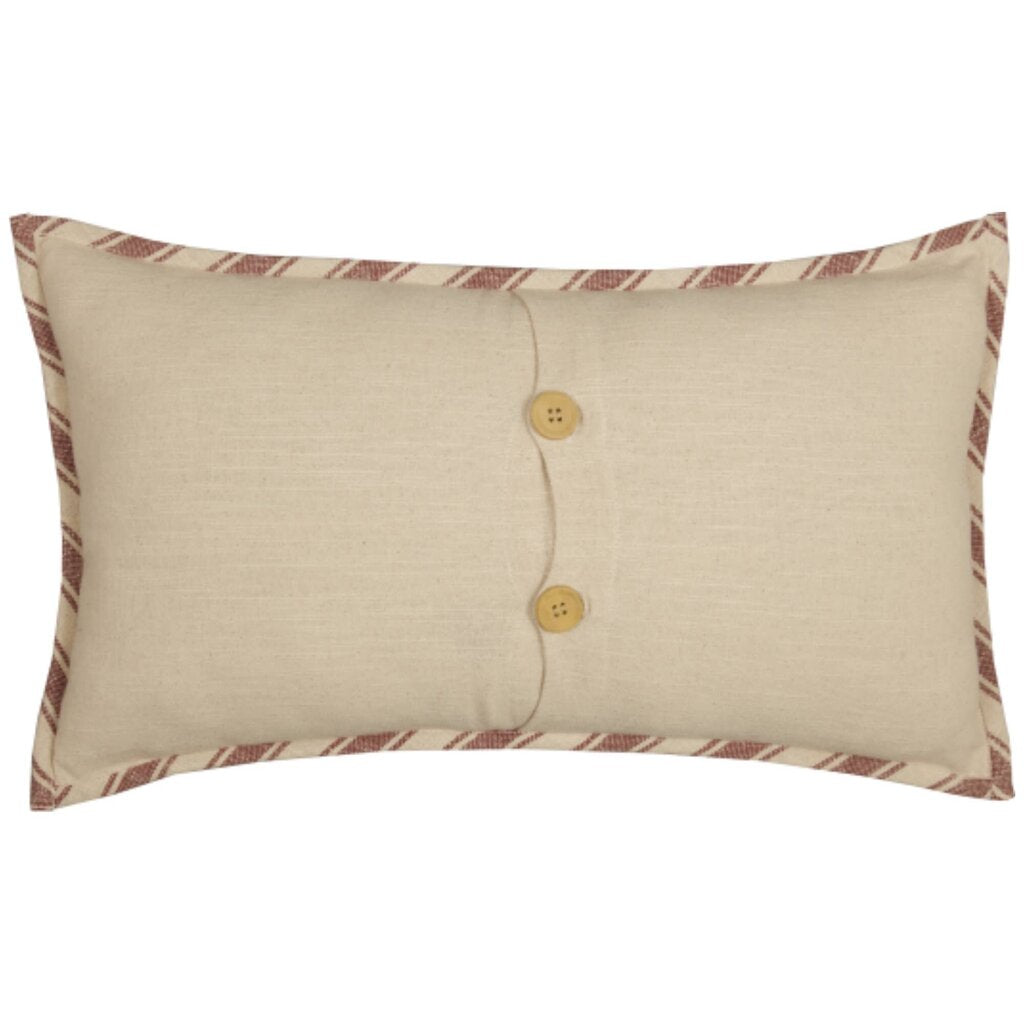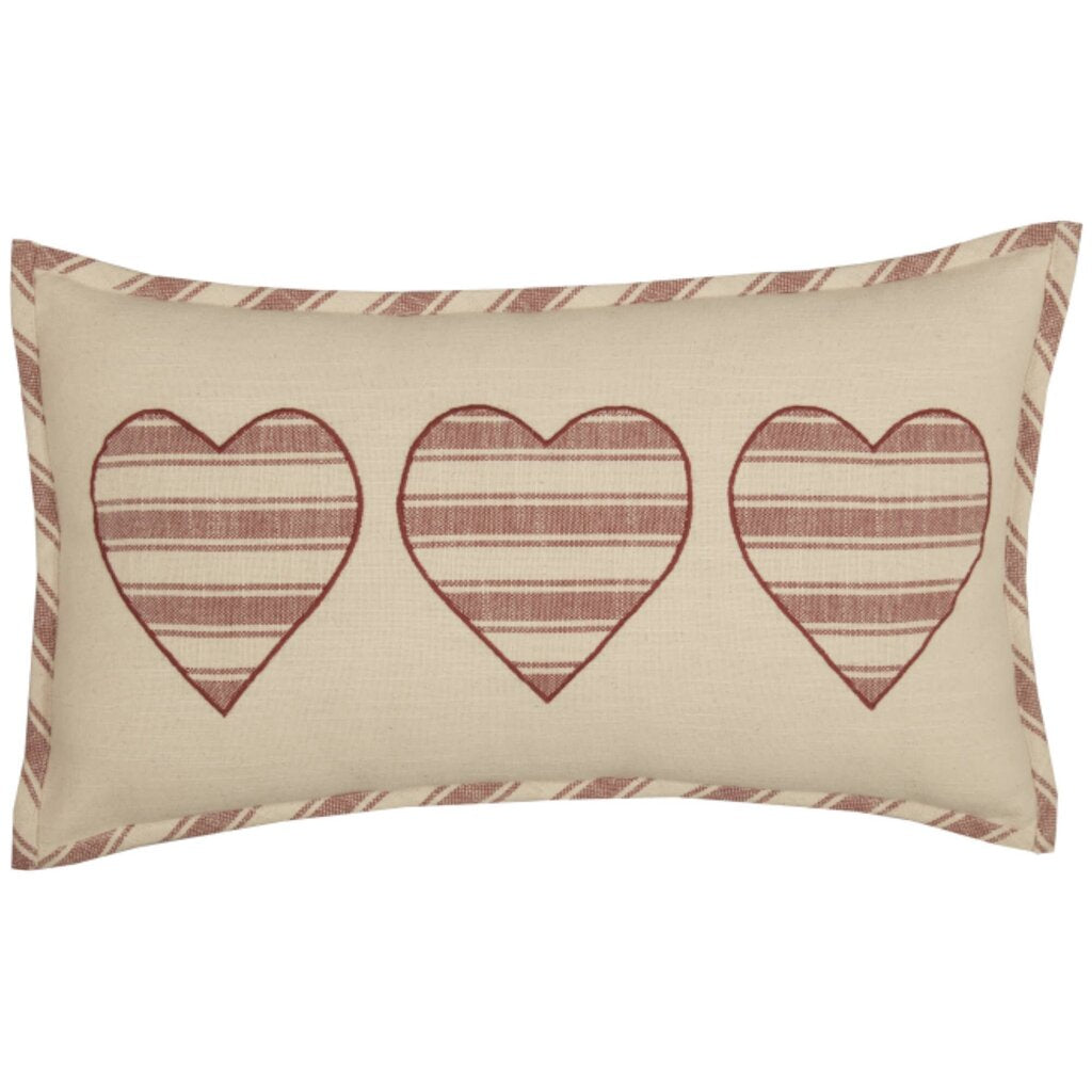 We LOVE stripes and grain sack fabrics and we know that you do too! When we combined grain sack fabric with wide ticking stripes in our Market Place Collection, we created one of our most popular and timeless farmhouse styles. We've been hearing for some time now that many of you would like to see the Market Place in a true farmhouse red. Well, here it is, and we just know you're going to love it! We chose a beautifully textured, substantial weight cotton fabric with a surprisingly soft hand feel for this collection. Three hearts in repeating red ticking stripe fabric are appliqued to the creamy white base creating a delightful contrast. A border in the same ticking fabric set on a bias, highlights all four edges of the pillow. The 12 x 20 pillow reverses to same cream fabric with 2 natural wooden buttons (one extra sewn inside, just in case!) that offer a decorative touch and hold the insert in place. Includes: 1 x Pillow Cover Care Instructions: Machine Wash, Tumble Dry.